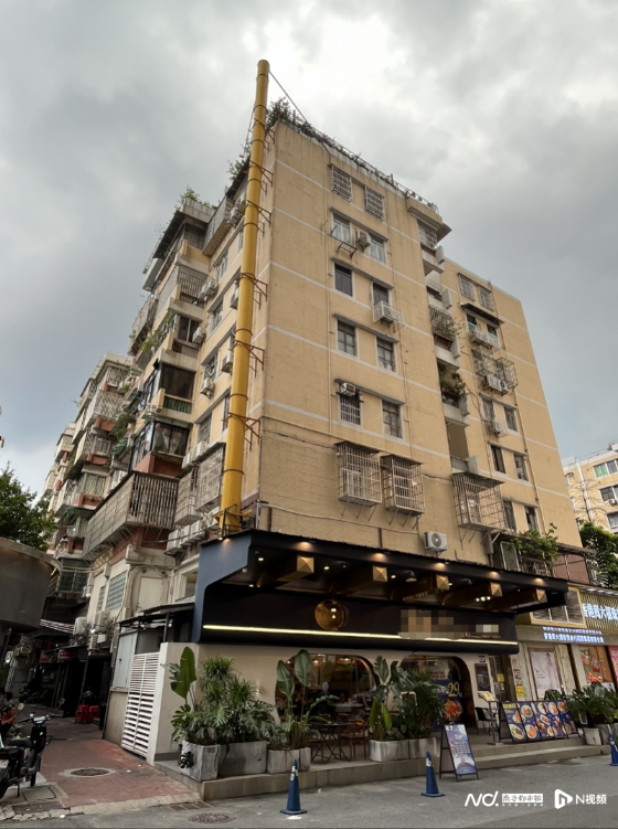 江南西商圈,一家居民楼底层的餐饮店加装有高空排烟管道。
